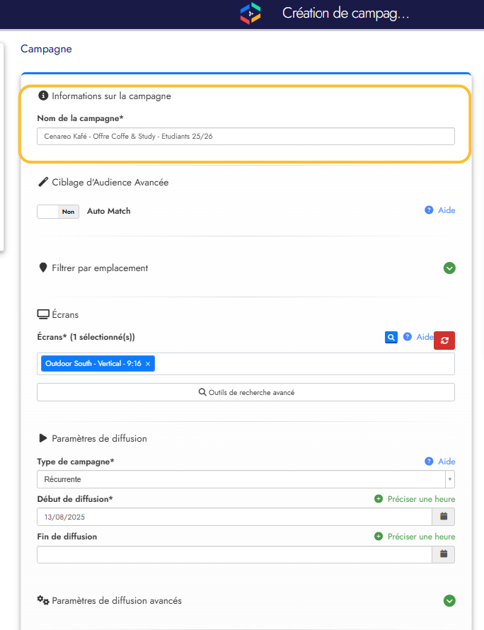 La plupart du temps, la gestion des campagnes est collaborative. Bien le nommer vous permet d'assurer un suivi rapide et une collaboration efficace. Il sera plus facile pour votre équipe de retrouver les campagnes à suivre et à traiter sur la plateforme.