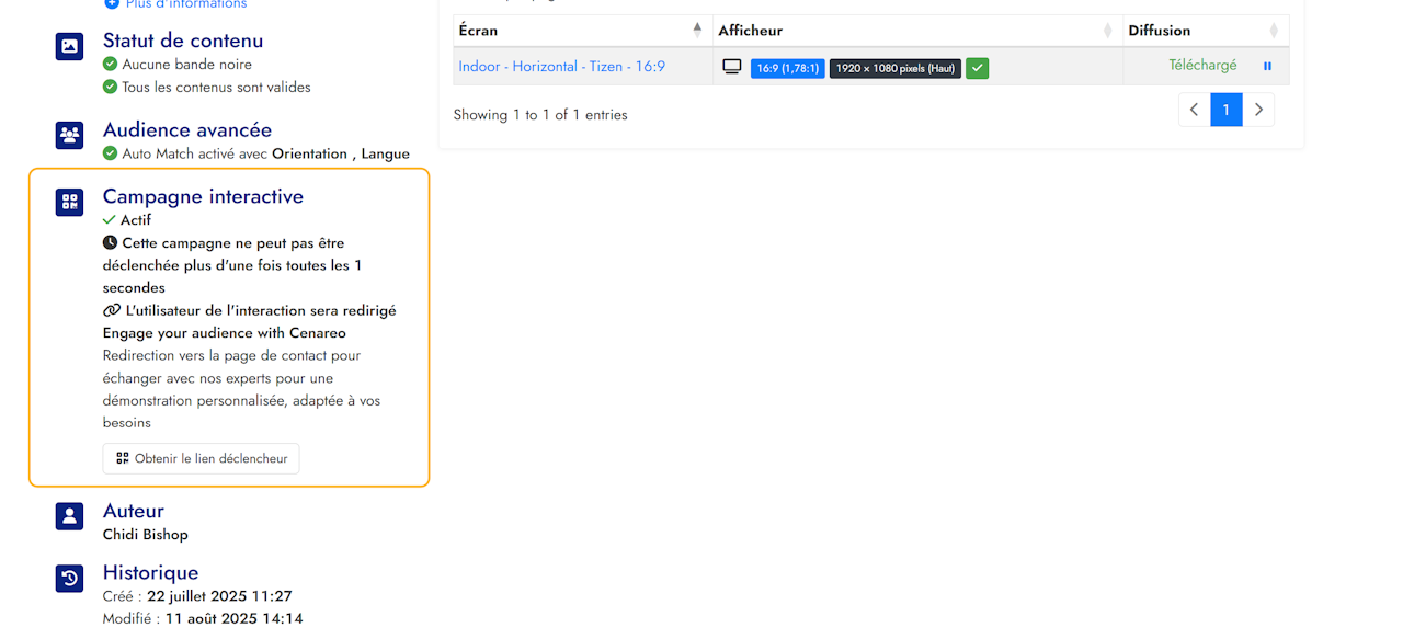 Vous retrouvez les différents paramètres de votre campagne interactive, ainsi que la dernière fois où votre lien a été déclenché.