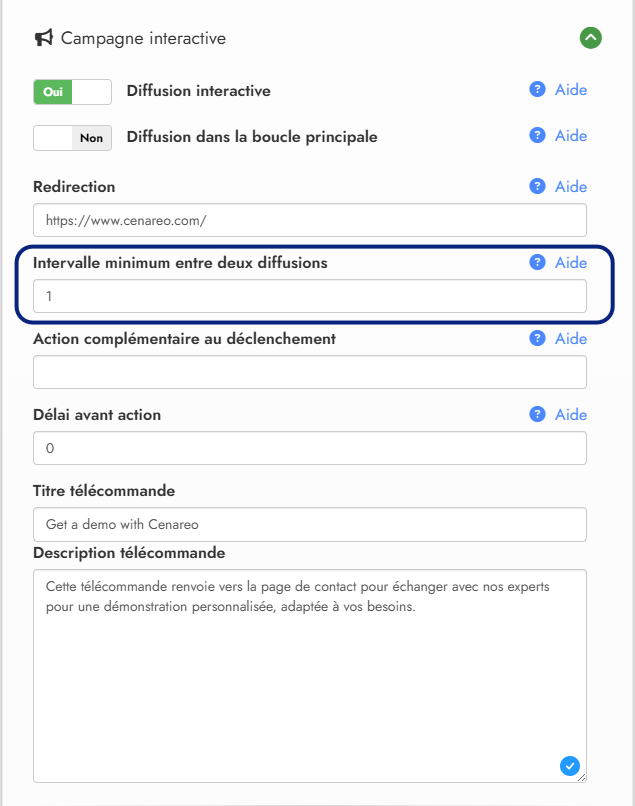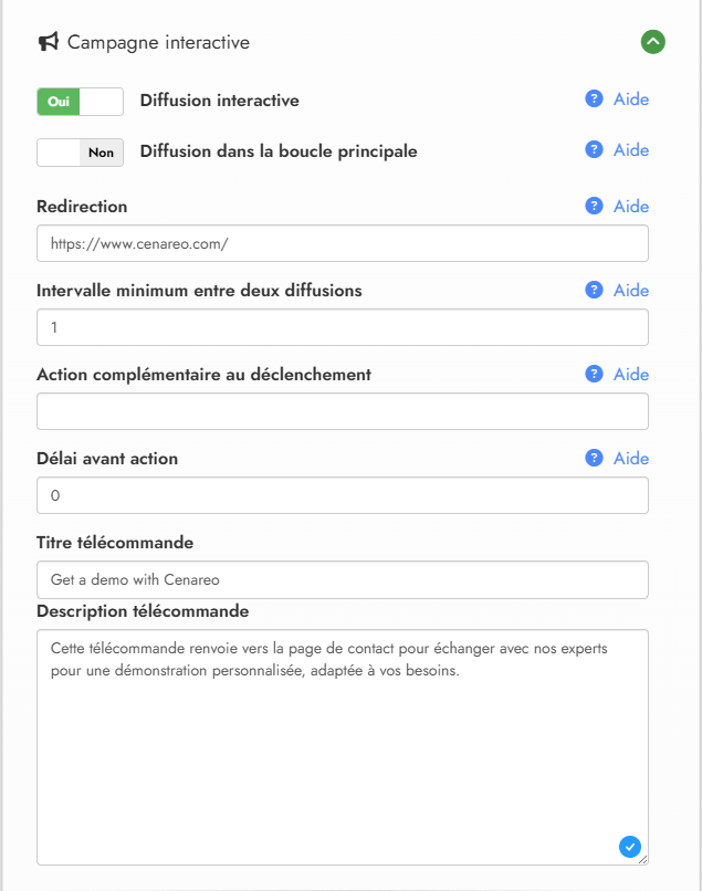 Tous les paramètres liés à la campagne interactive se trouvent dans le formulaire de configuration de la campagne.