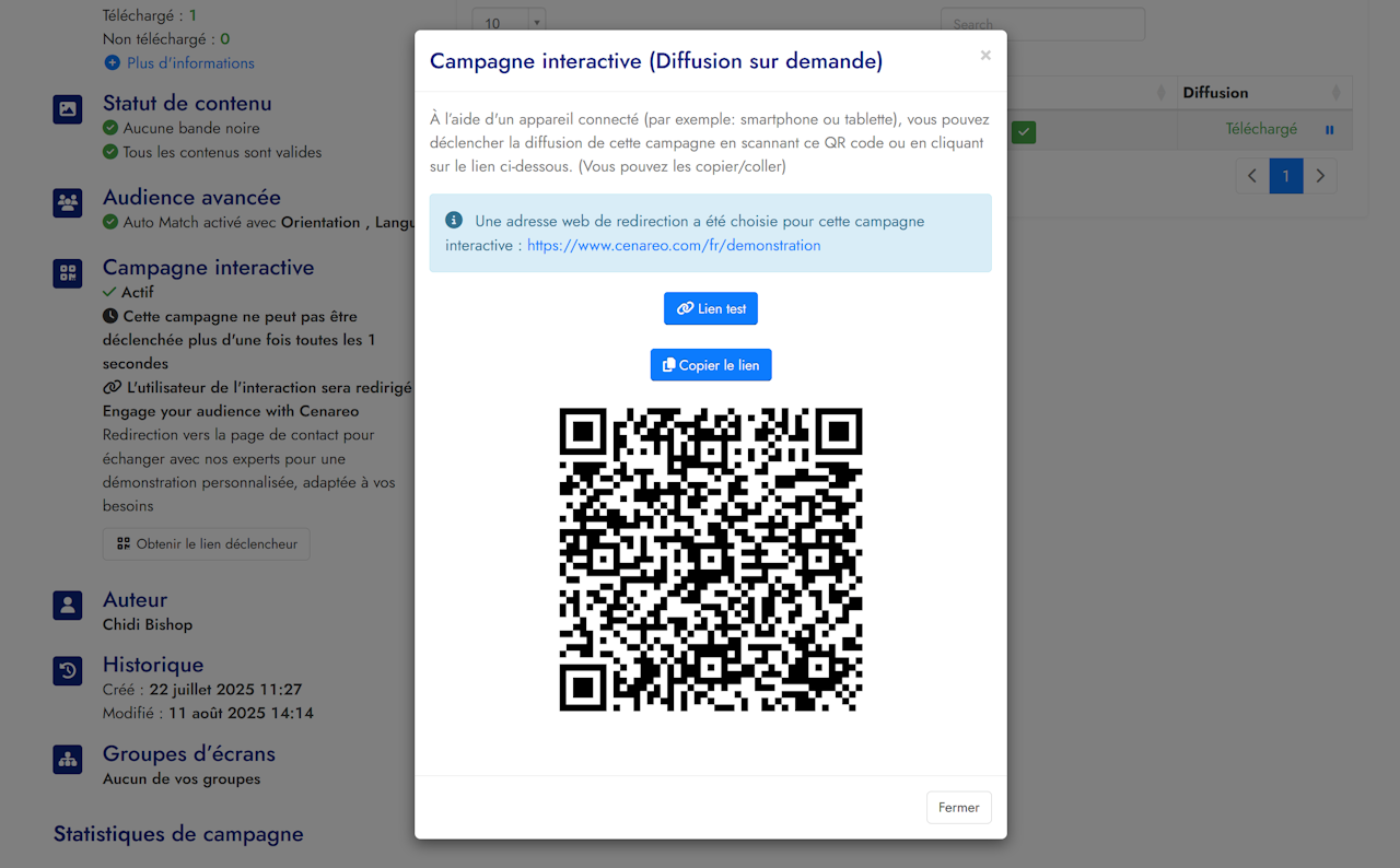 Vous retrouvez les différents paramètres de votre campagne interactive, ainsi que la dernière fois où votre lien a été déclenché.