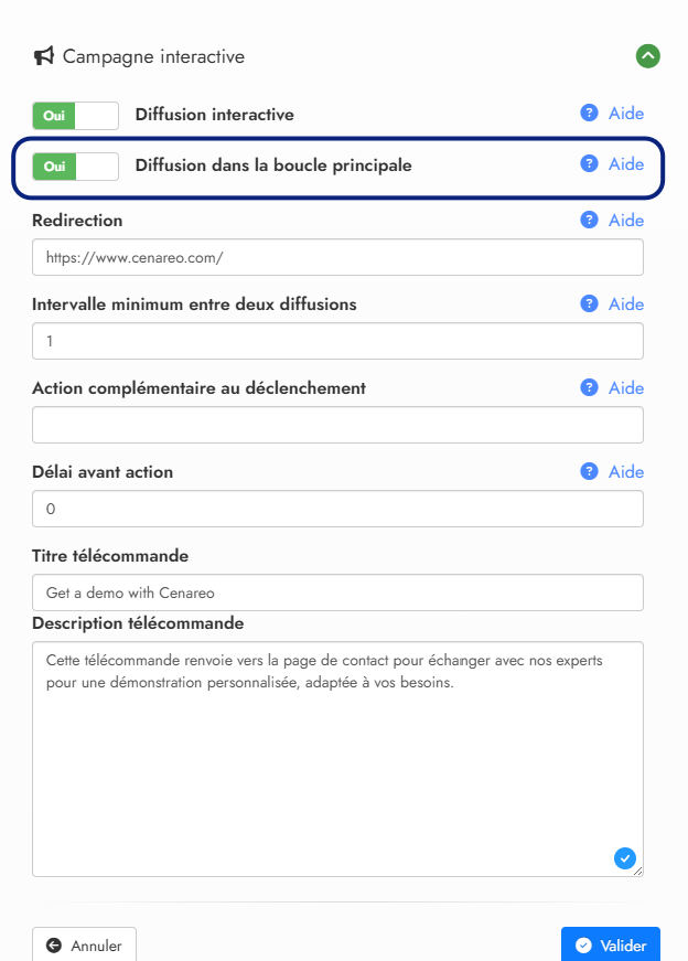 Activée : Le contenu s'affiche dans la rotation normale de vos écrans ET peut-être déclenché manuellement. C'est parfait pour les offres importantes que vous voulez montrer à tous, tout en offrant plus de détails sur demande.