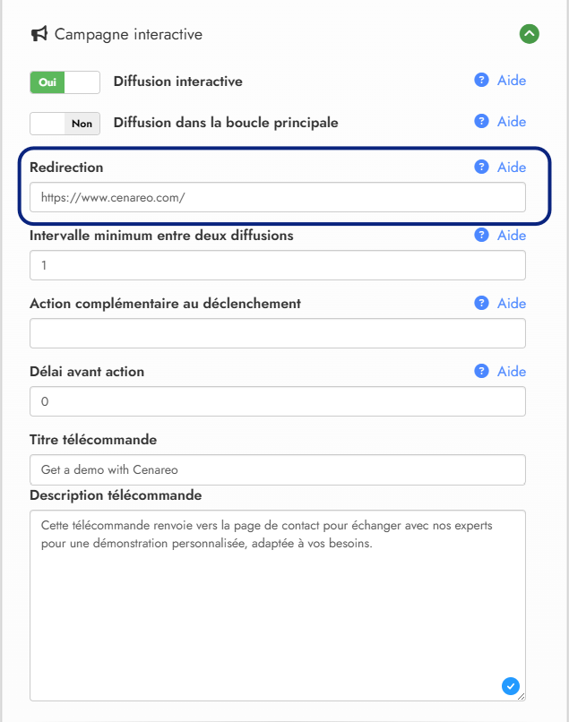 En plus de diffuser votre contenu sur les écrans, vous pouvez, en parallèle, rediriger automatiquement votre audience vers une page web après le déclenchement de la campagne. Par exemple :