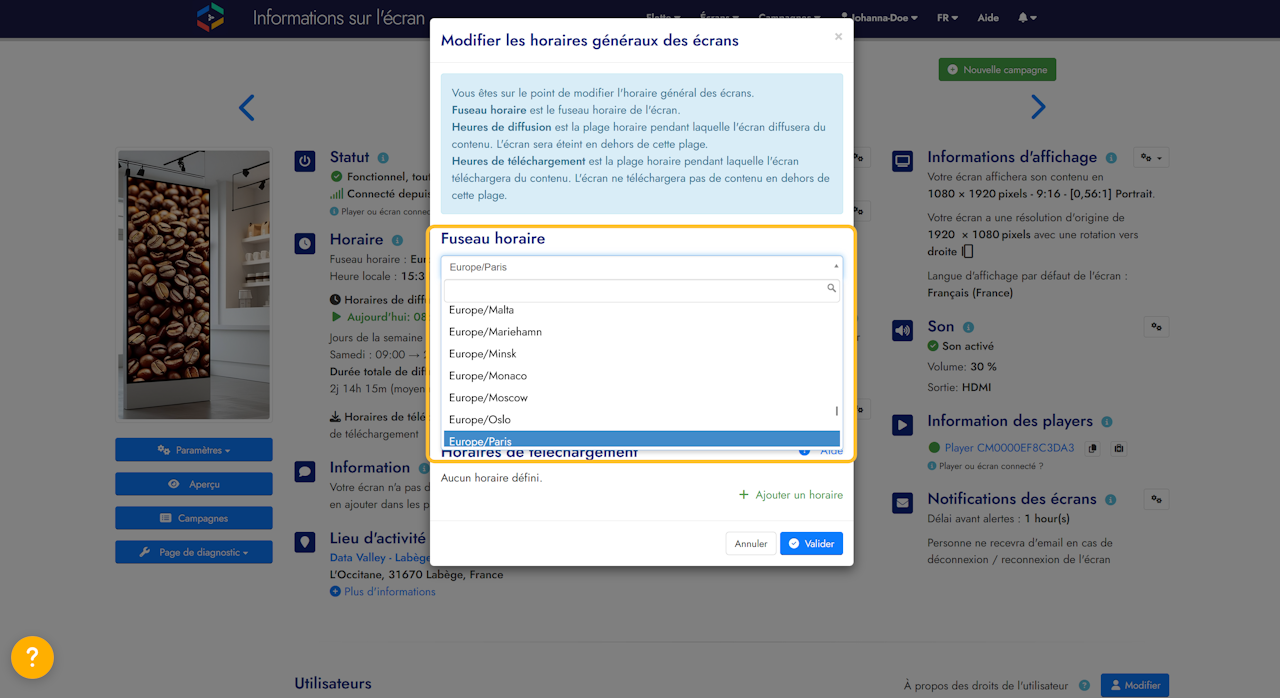 Pour garantir une diffusion correcte des contenus selon l’heure locale de l’écran, il est important de définir le bon fuseau horaire.