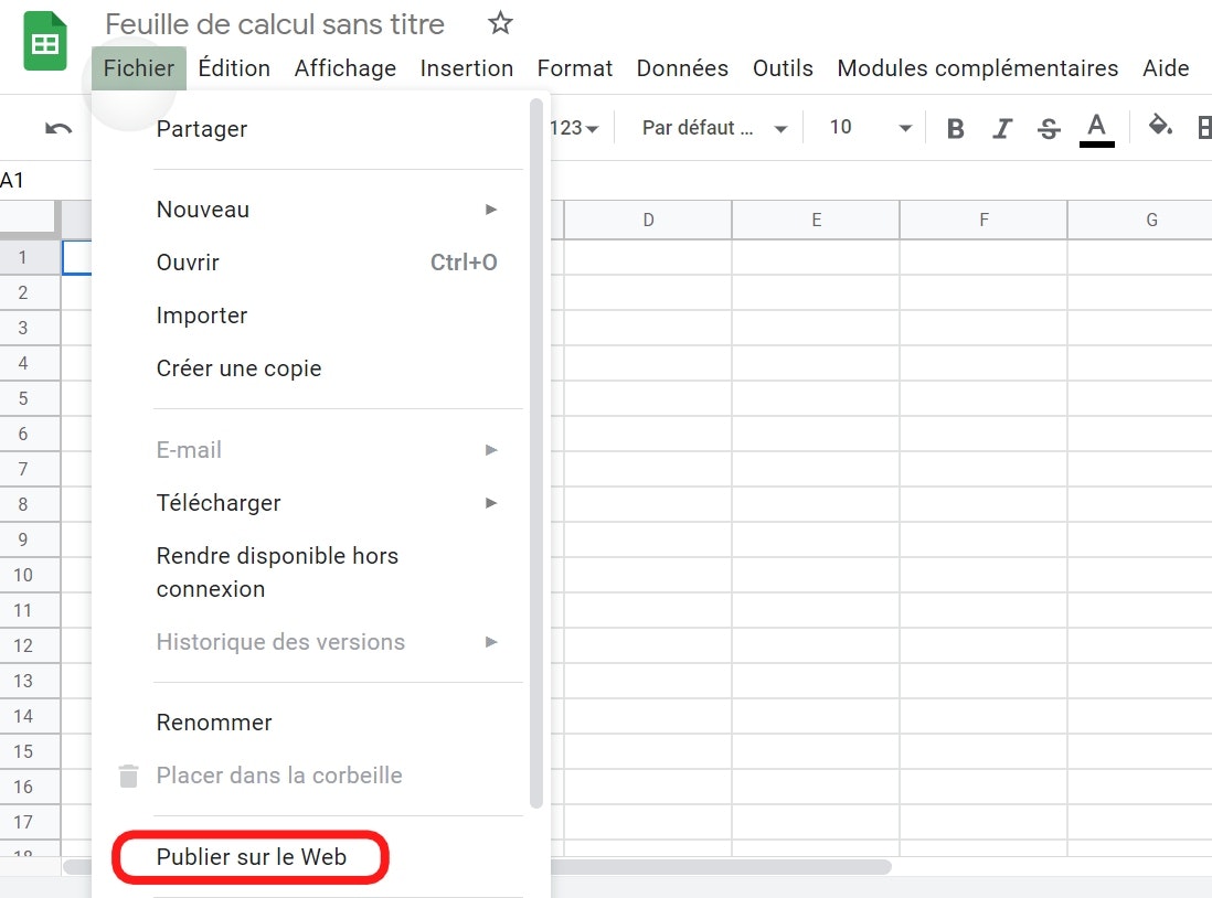 Depuis votre SpreadSheet, cliquez sur “Fichier” > “Publier sur le web”. Sélectionnez la feuille que vous voulez afficher, sélectionnez “Page Web” et récupérer le lien.