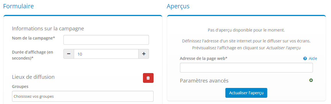 Puis créez une campagne web, et veillez à ce que la période de rafraichissement de l’affichage correspondent à la période de rafraichissement de vos données.