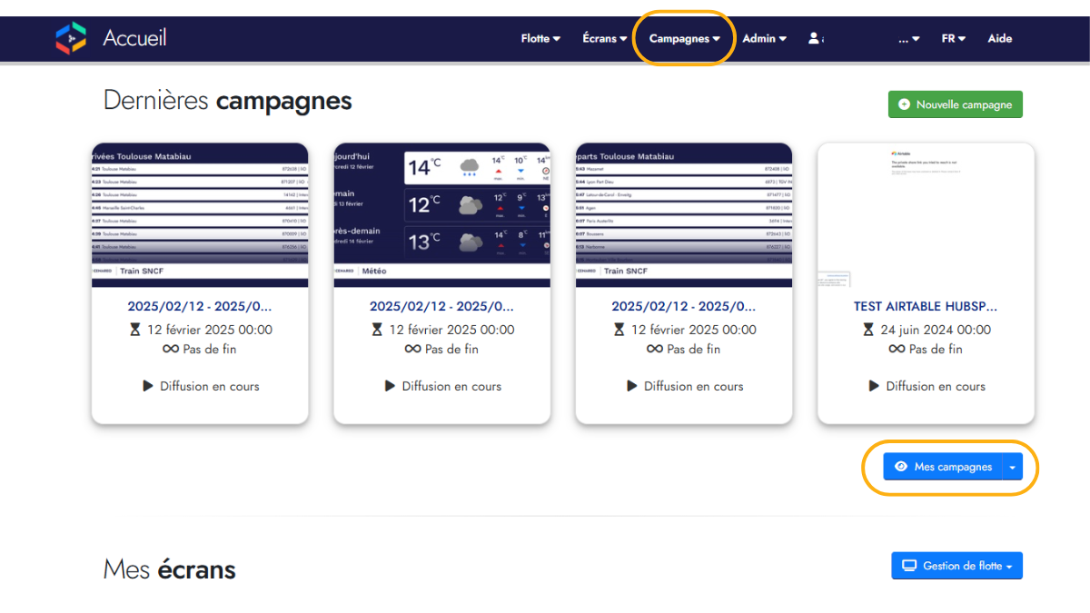 Ecrans : Affiche les campagnes diffusées sur un écran