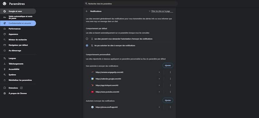 Chrome : Paramètres > Confidentialité et sécurité > Paramètres des sites > Notifications > Ne pas autoriser les sites à envoyer des notifications