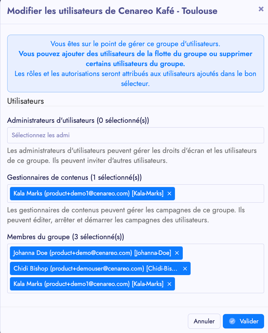 Dans la fenêtre pop-up qui s'affiche, ajouter ou supprimer un ou plusieurs utilisateurs dans le champs " administrateurs de groupes" et/ou "Gestionnaire de contenu" et/ou membres du groupe.