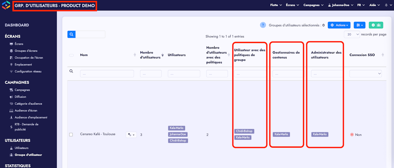 Les membres du groupe d'utilisateurs bénéficient des accès aux écrans du groupe, des fonctionnalités et politiques spécifiques du groupe d'utilisateurs auxquels ils sont rattachés.