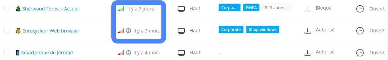 Une fois sur votre espace client, allez sur l'onglet "Ecrans" et regardez si l'écran concerné est bien connecté. Si le symbole de la connection au réseau est vert, l'écran est connecté, si le symbole est rouge, il n'est pas connecté.
