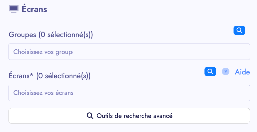 Cette section vous permet de choisir précisément où votre campagne sera diffusée, soit en sélectionnant des groupes d’écrans, soit des écrans individuels.