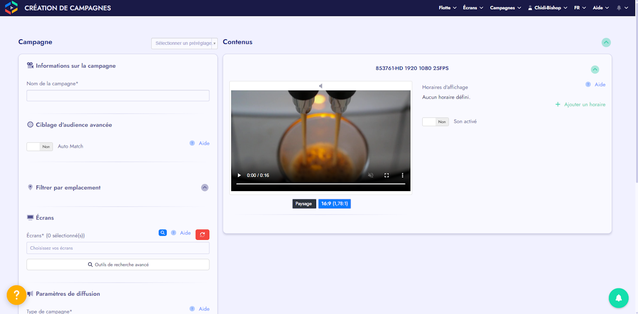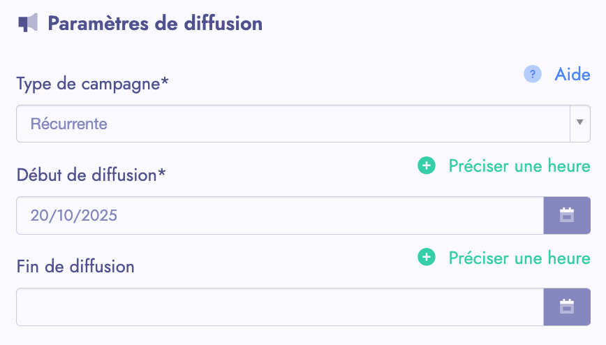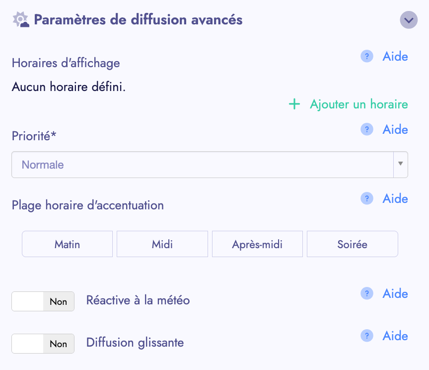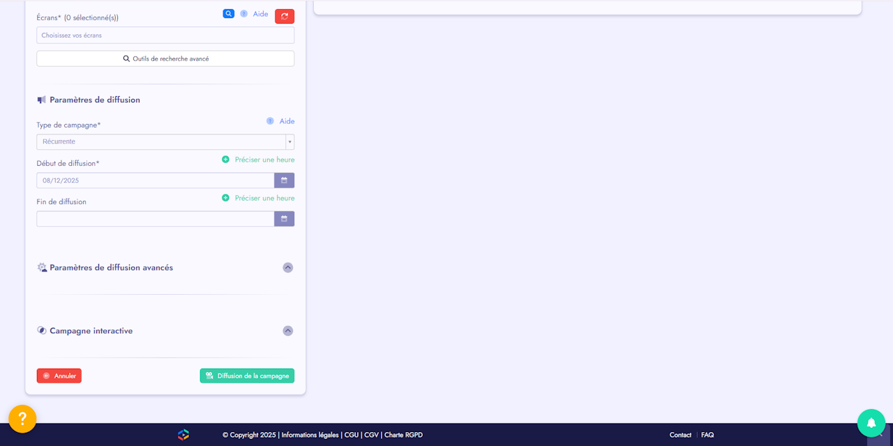 Les paramètres de diffusion vous permettent de définir quand et comment votre campagne sera diffusée sur les écrans sélectionnés. Ils regroupent l’ensemble des réglages essentiels pour organiser votre programmation :