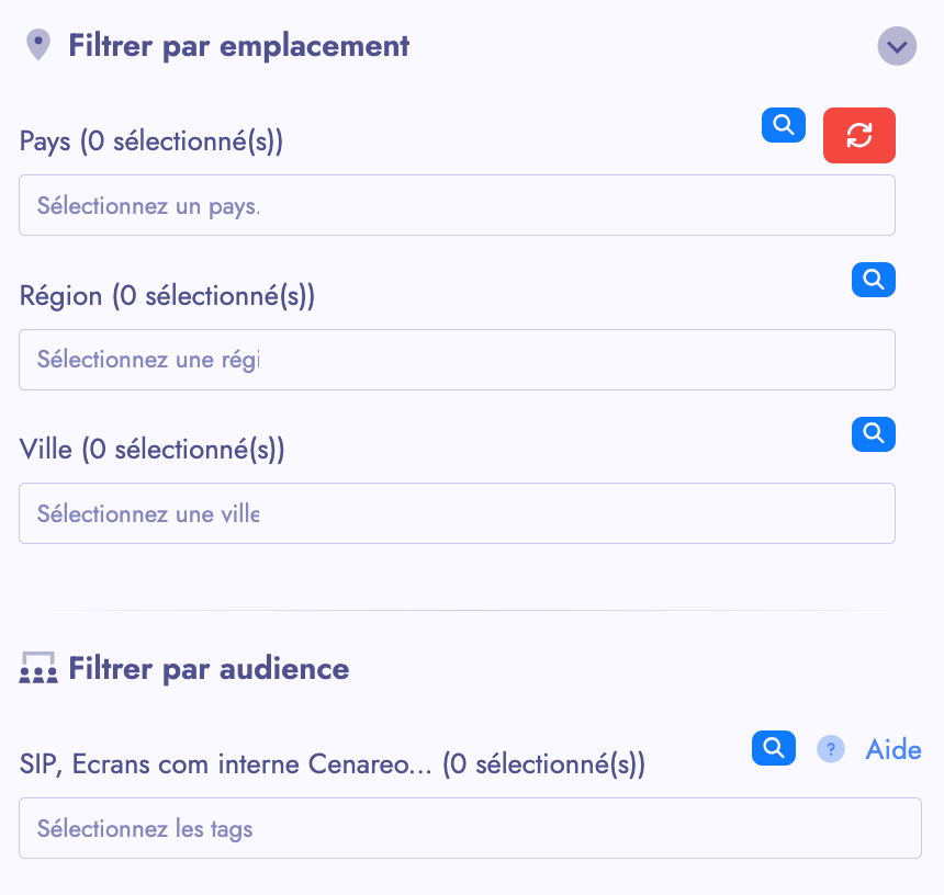 Le filtrage par emplacement vous permet de sélectionner précisément les écrans en fonction de leur localisation géographique. C’est un outil idéal pour diffuser vos campagnes uniquement dans les zones pertinentes.