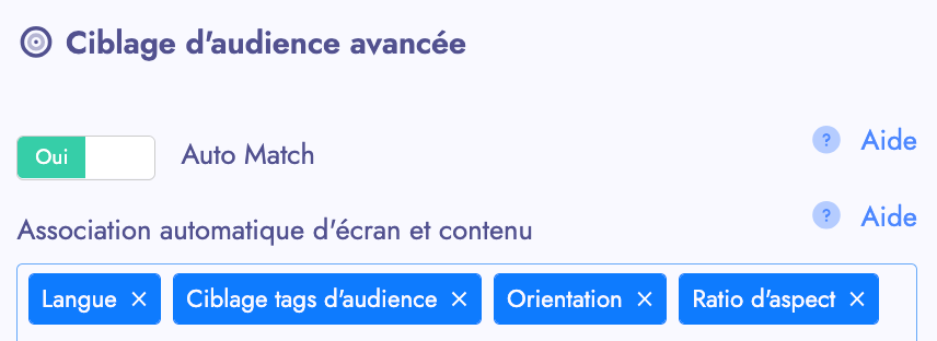 La fonctionnalité de Ciblage d’Audience Avancée, avec Auto Match vous permet de choisir de manière précise sur quels écrans votre contenu sera diffusé. Grâce à des options d’association automatique, vous gagnez en efficacité tout en garantissant une diffusion optimale.
