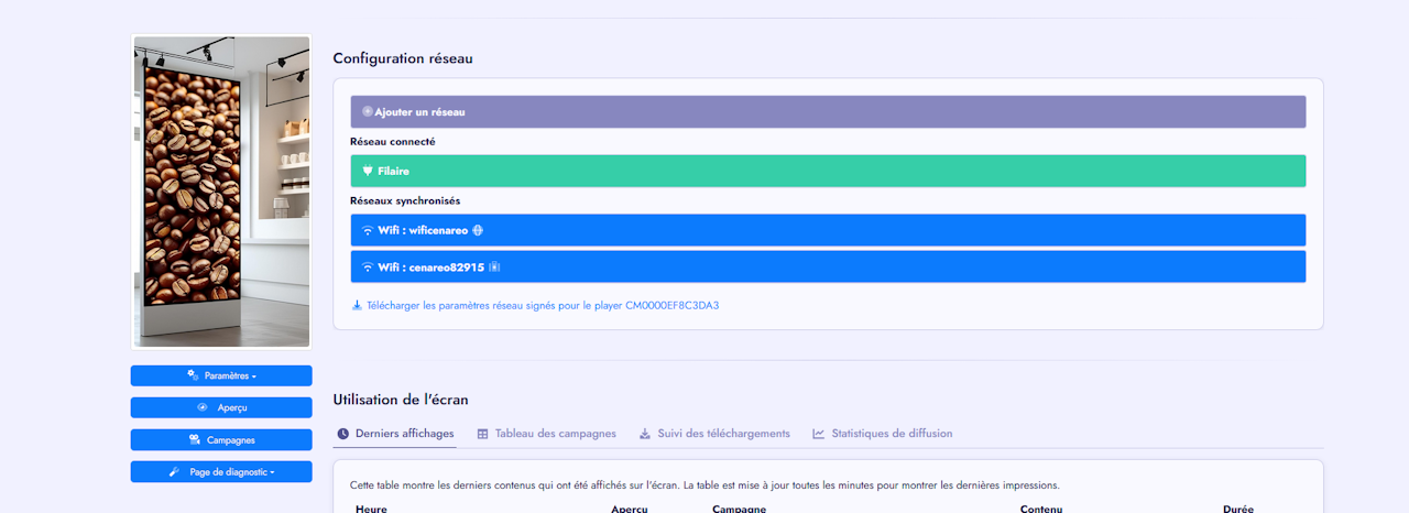 Le player utilise Internet pour diffuser les contenus sur vos écrans. Si la connexion est interrompue pendant un certain temps, la diffusion peut être impactée.