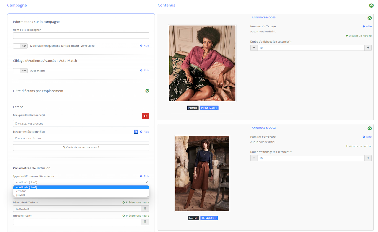 Sur le formulaire de paramétrage, sélectionnez "Playlist" dans le type de diffusion mutli-contenus et configurez le reste de votre campagne normalement.