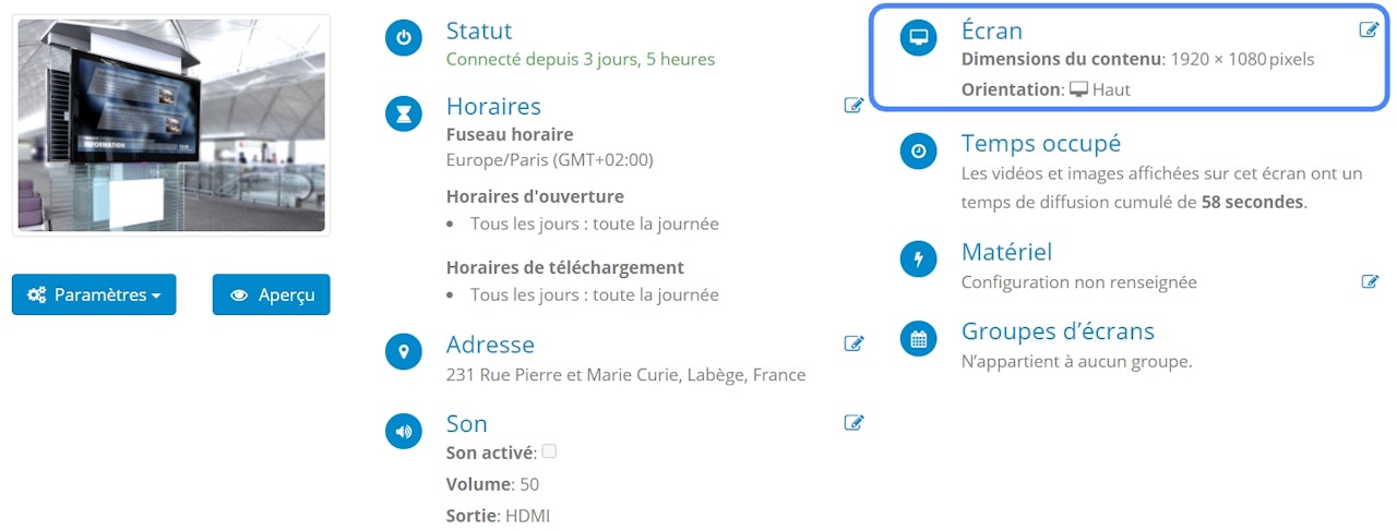 L'orientation (ou rotation) de l'affichage sur l'écran se règle directement depuis la plateforme Cenareo. Les paramètres renseignés sont envoyés au player qui adaptera l'affichage en fonction. Pour régler l'orientation d'un player, rendez-vous sur la page de l'écran, cliquez sur "Paramètres" puis "Modifier l'orientation".