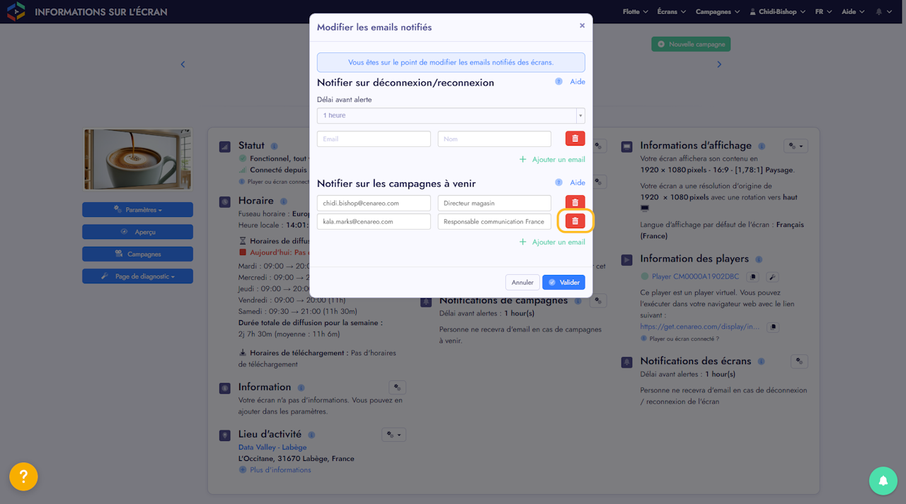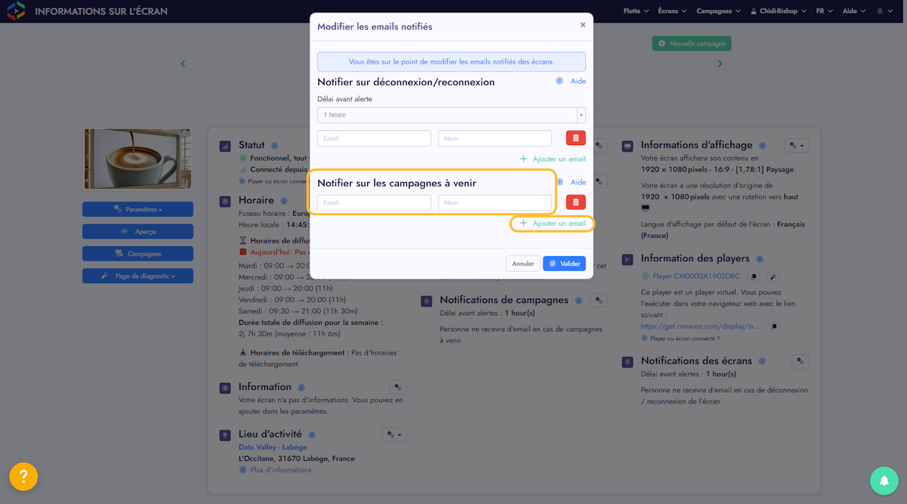 Vous souhaitez que votre équipe soit automatiquement informée dès qu'une nouvelle campagne est planifiée sur un écran spécifique ? Ce guide vous explique comment ajouter ou supprimer les destinataires de ces alertes par email.