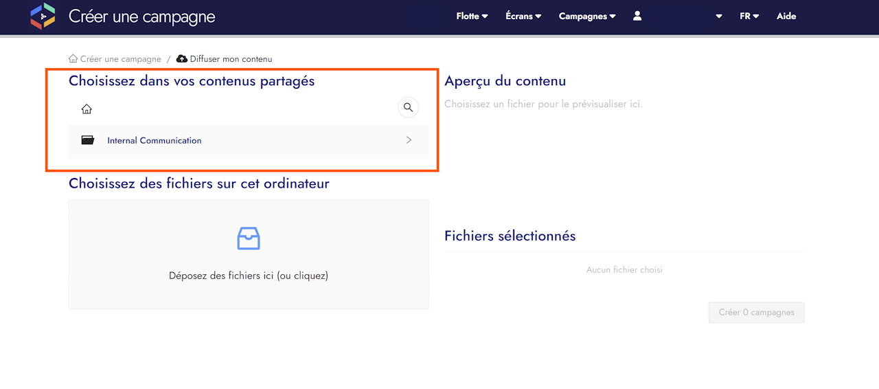 Dans Cenareo, ces contenus sont accessibles à la création d'une campagne, en haut à gauche du sélecteur, sous forme de sources externes connectées (Google Drive, OneDrive, Pimcore via WebDAV...).